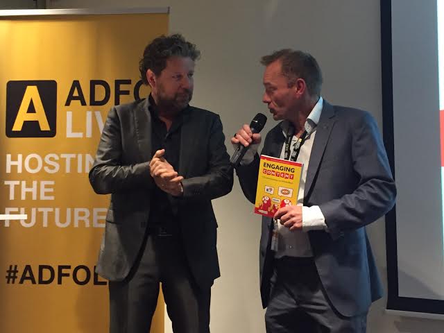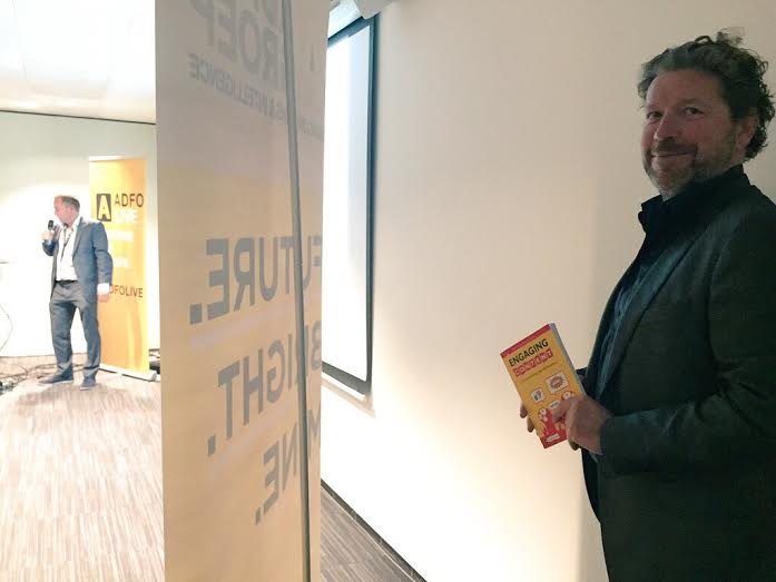 @HenkjanSmits reikt eerste exemplaar ‘Engaging Content boek’ uit op @AdfoLive #X-Factor